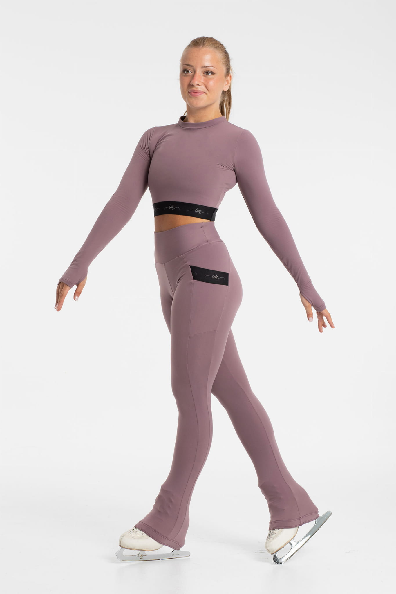 Agata Heel Cover Pants Brushed Fabric Inside with silicone band for Figure Skating Intermezzo. High rise and wide waistband. Side pocket with elastic Intermezzo logo. Soft, stretch and comfortable fabric for your training. Perfect for your figure skating sessions. Girls and women sizes in black, blue aqua or violet.