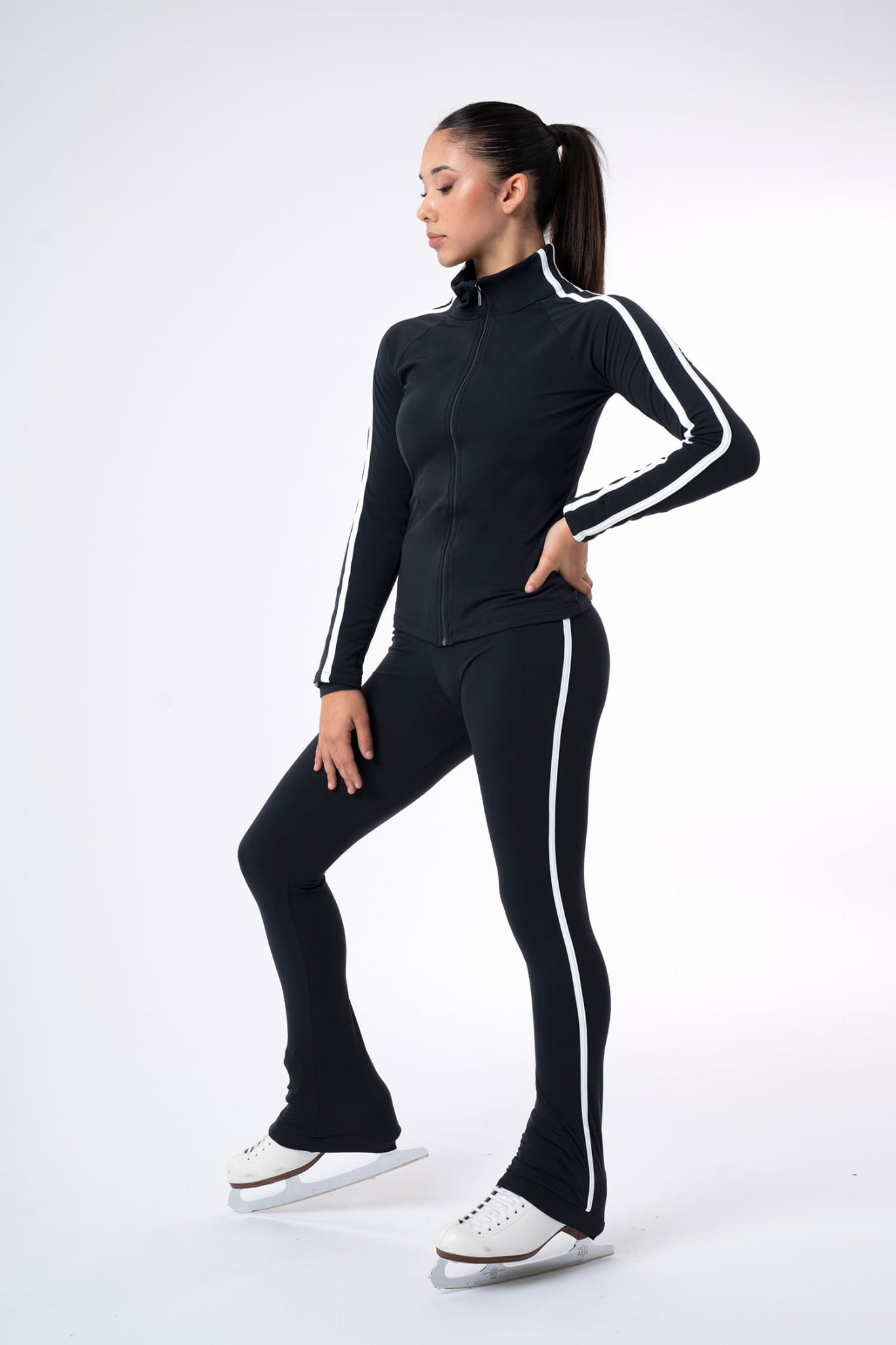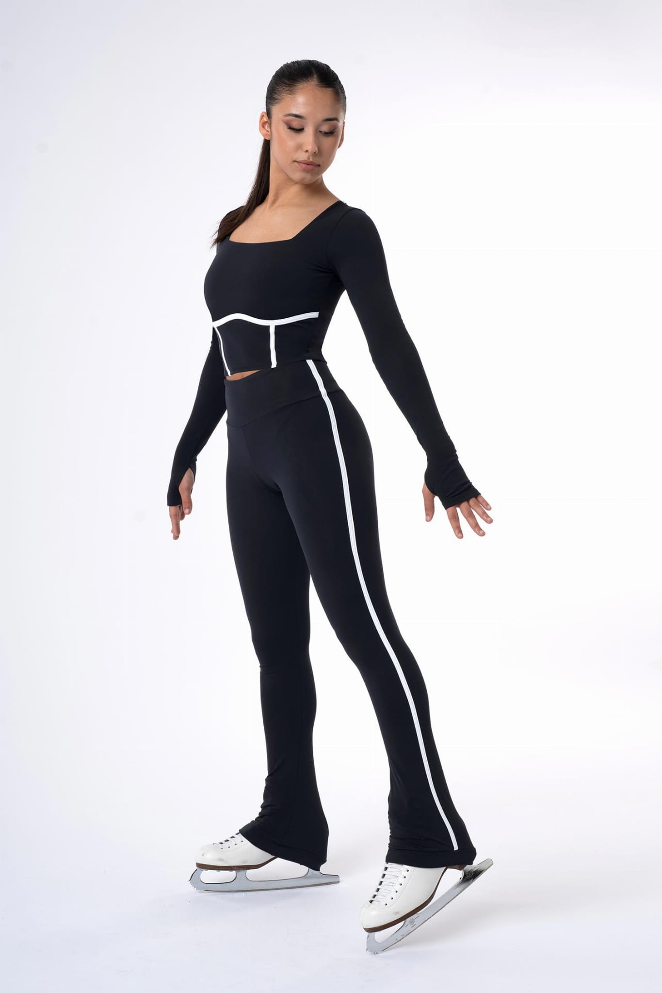 High-rise heel-covering leggings with a wide waistband, thin brushed fabric inside and silicone band at the hem to cover the heel. White piping detail.