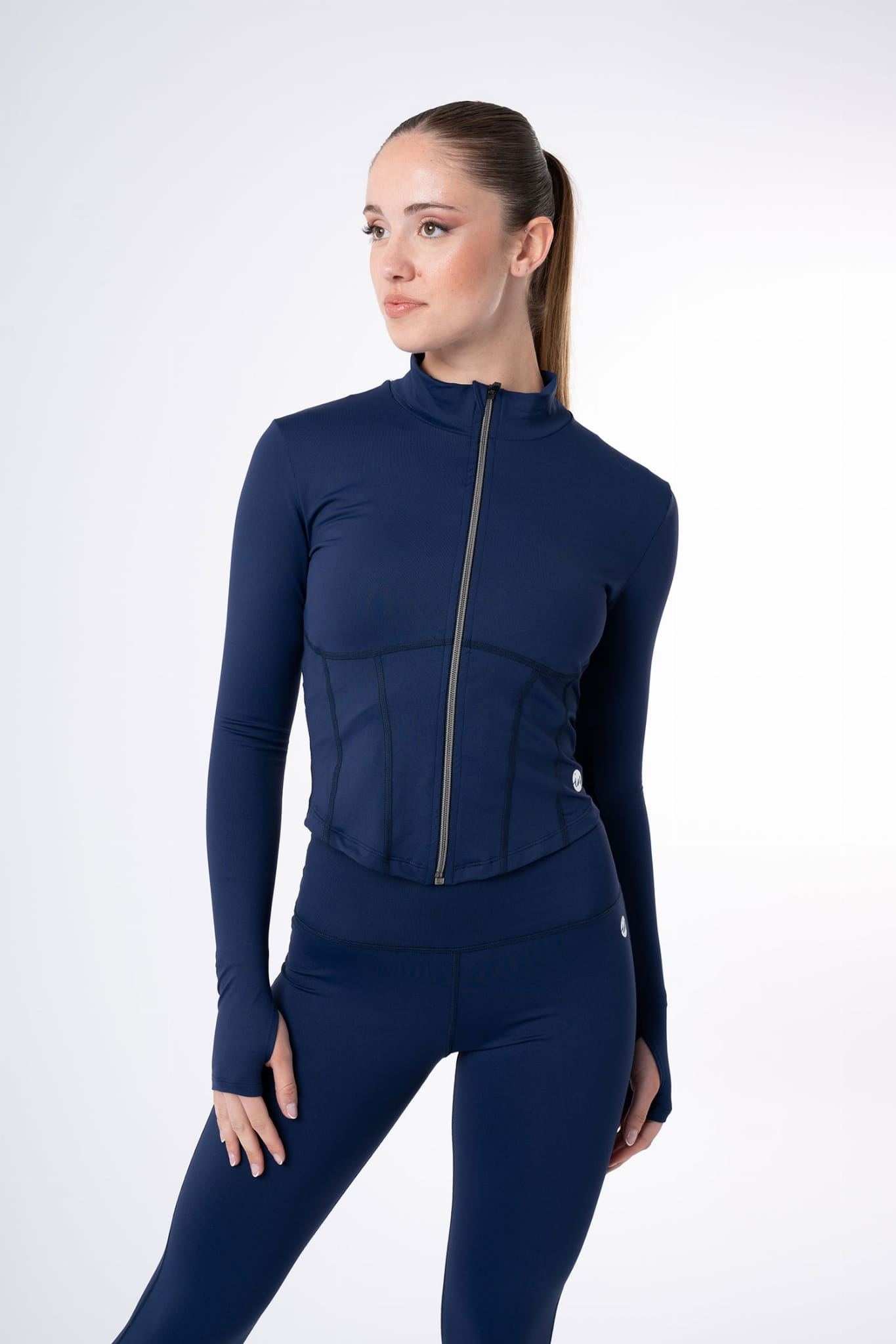 Erica Cropped Corset-Effect Jacket of Meryl Intermezzo. The Erica jacket blends elegance and functionality with a fitted design that enhances the silhouette. Featuring a corset effect and matching seams for a sleek look, it also offers a high collar and long sleeves with thumbholes for extra comfort. Finished with a grey zipper and white logo for a minimalist touch.