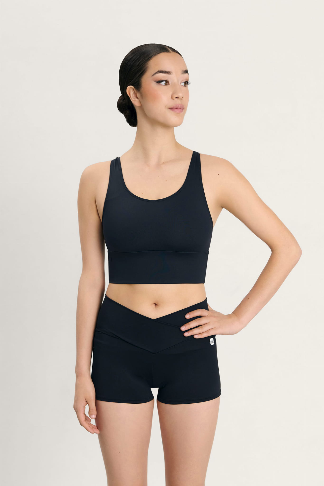 Sport crop top with wide straps and waistband. Crossed strap detail and keyhole opening on the back. Removable cups in adult sizes. Circular neckline. White logo. Soft-touch front lining.