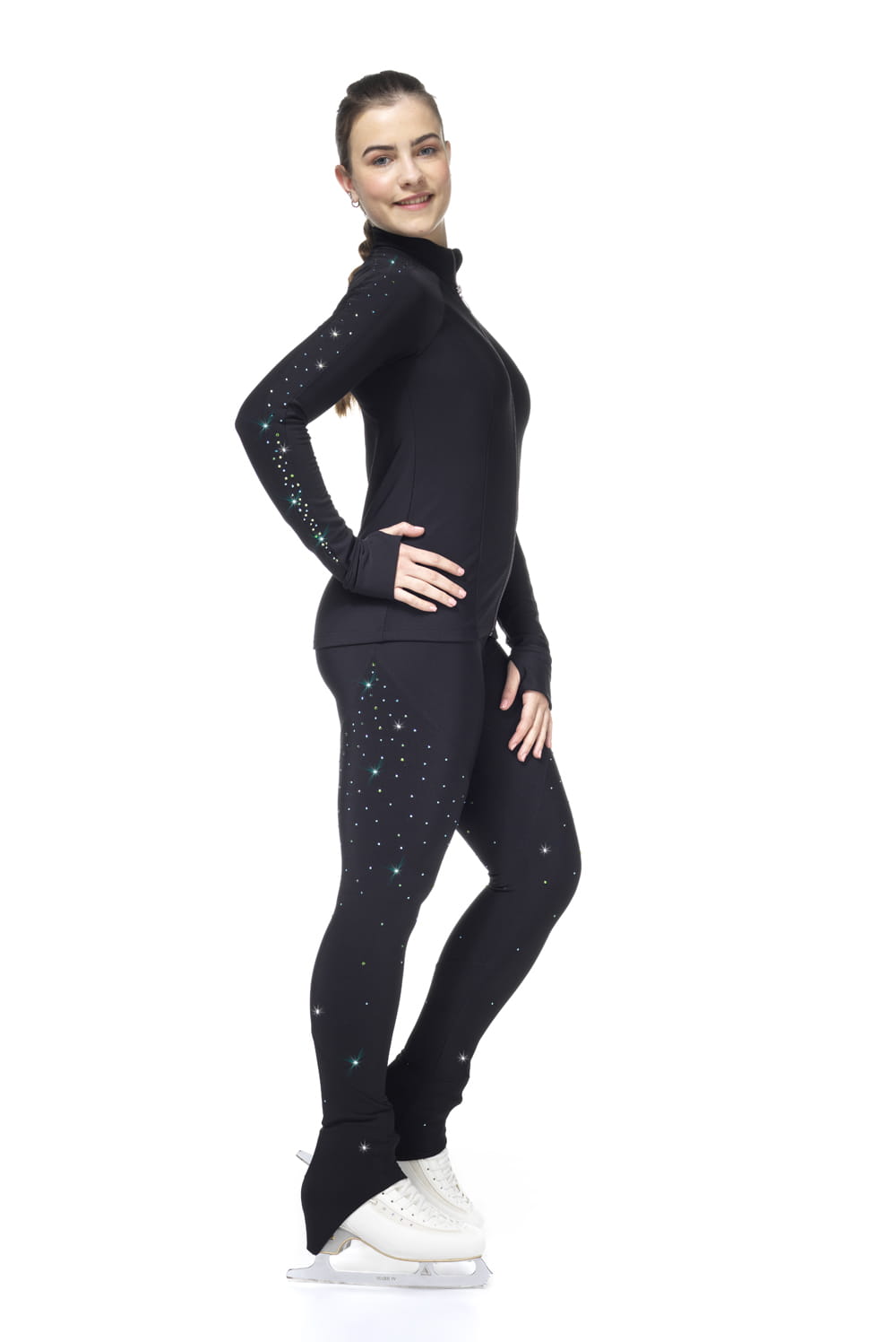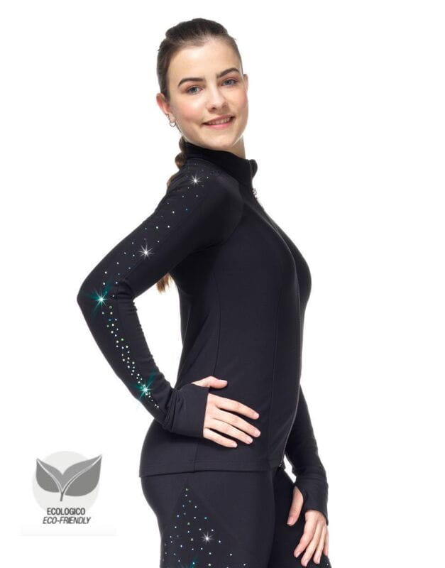 A jacket in thermal fabric made from recycled plastic, it is runproof, breathable and embellished with coloured crystals in two shades of green.