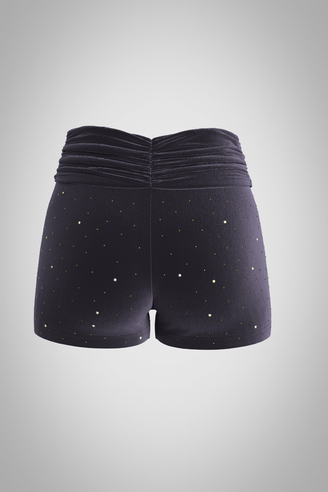 Elegant shorts made of soft and luxurious velvet, extremely comfortable and form-fitting, featuring a smooth and silky weave that makes it particularly soft and pleasant to the touch. The light reflected in various ways gives the fabric a shimmering and refined effect. Designed with a ruched waistband that adds dynamism and movement to the garment. It is adorned with a cascade of golden studs and scattered aurora borealis golden crystals that seem to change colour depending on the light angle. This detail makes it a unique, luminous, and sophisticated piece, perfect for shining on the rink during skating practice.